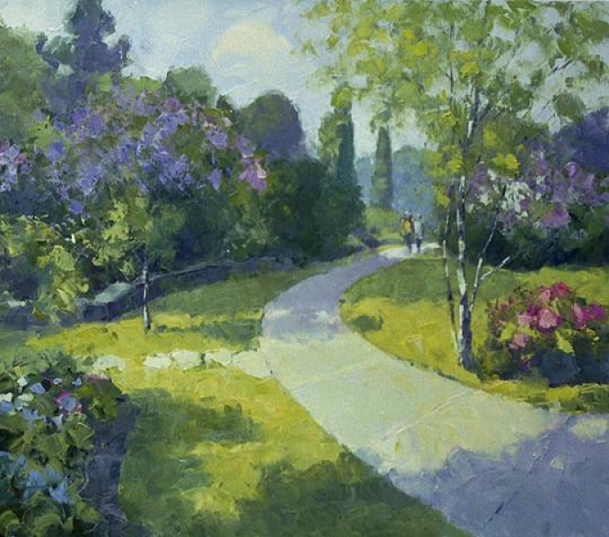This is one of the few landscapes I do in the studio, working from an earlier painting done on location in Frances Park near my home. About an hour afer beginning to paint on the site, an automatic sprinkler popped up and began spraying water about 10 feet from me, which I had to deflect with a palette board to avoid being drenched. A park employee came by and told me, laughing, that he couldn't turn it off. It quit about 45 minutes later.