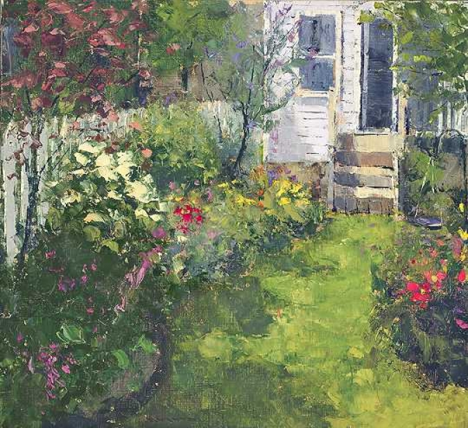 Certainly painting is not generally considered one of the performing arts, but when working on location, it can sometimes feel as if it is. This was painted in a private garden that was open to the public one July afternoon, during a benefit garden tour. About 300 people filed past my easel, with most of them making unsolicited comments about the painting in progress. Fortunately, most of them were positive. The painting was purchased by the garden owner.