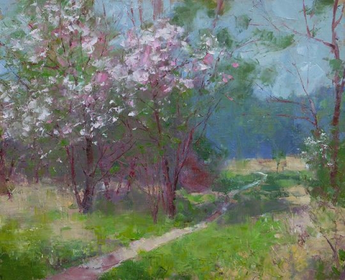 Flowering trees are a particular delight, and have always been a favorite painting subject. While painting this on location in a nearby park, passers-by said that at first they thought I was operating a lemonade stand, due to the umbrella I use to shade the canvas. After the 3rd or 4th time, I began to think I'd missed my true calling!