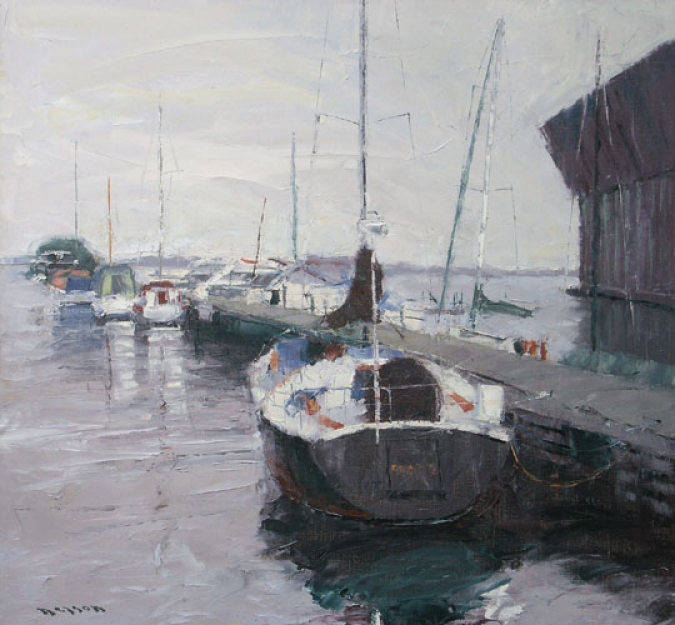 Boats at anchor in the lower harbor at Marquette, Michigan on Lake Superior. The large structure at far right is the old docks once used to load iron ore onto large 'ore boats'. A grey day with a little sun peeking through. -